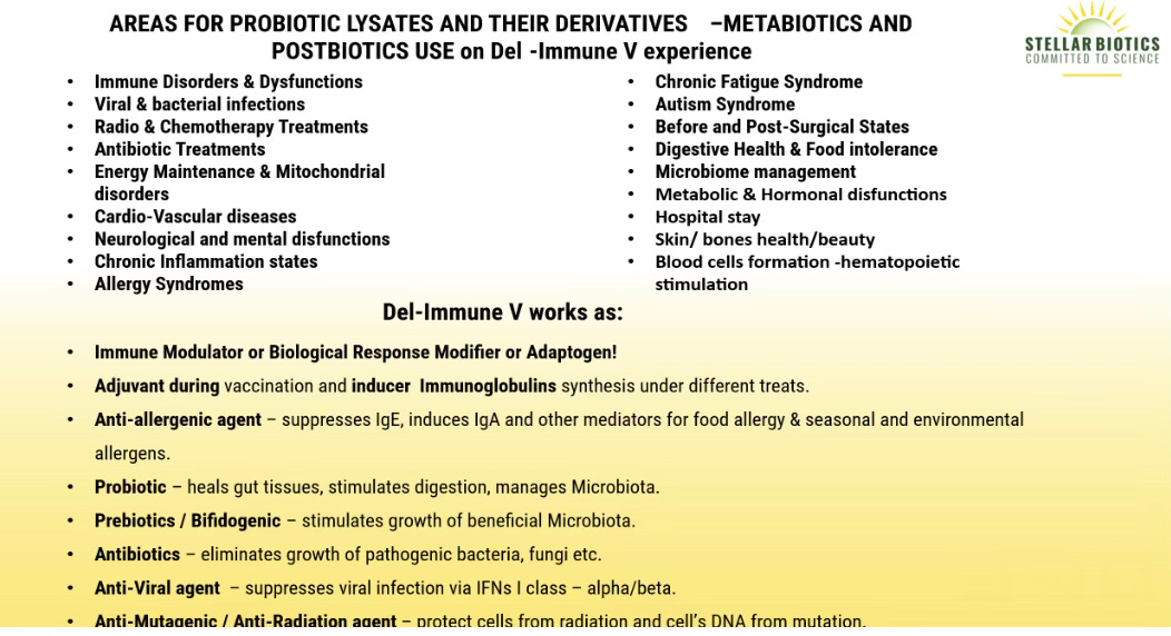 Stellar’s probiotic del-Pro has Lactobacillus plantarum LM – a potent multifunctional strain; probiotic del-Pro was used by children with autism with positive results; del-Immune V was tested in clinical conditions for food allergy, asthma, multiple metabolic dysfunctions, including T2D and colorectal cancer, with positive outcomes.