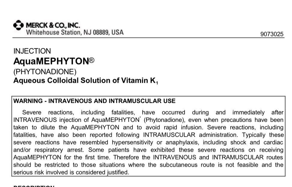 Here is Vitamin K given to every newborn in the hospital at birth. Click to read this Merck toxin, “fatalities” listed on page 1!!!!