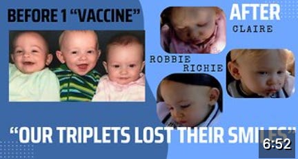 Here is my interview, as you can also see in the BigTree film, the triplets who all have severe brain damage from one shot (pneumococcal at 9 months) you can hear the data from retired pediatrician Dr Paul Thomas HERE and if you want the full hour it is HERE. Here are the triplets brained damaged in one day by pneumococcal shot!